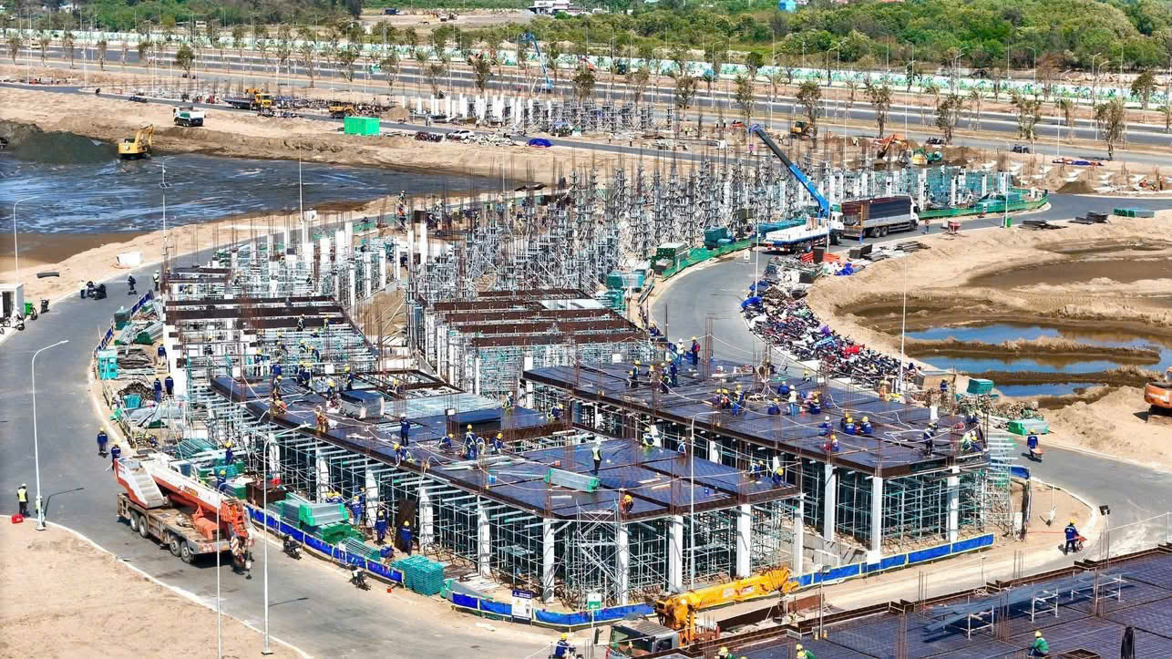 Tiến độ dự án Vinhomes Cần Giờ đang diễn ra vượt bậc sau kỳ nghỉ Tết Nguyên Đán 2026. Toàn bộ đại công trường đã quay lại nhịp độ cao, với trọng tâm là hoàn thiện hạ tầng khung và đẩy mạnh xây dựng nhà ở thấp tầng tại các phân khu ưu tiên. San lấp mặt bằng lấn biển đạt 75-80% khối lượng giai đoạn 1, đê kè chống sóng dài hơn 50km kiên cố, và hệ thống giao thông nội khu hình thành rõ nét – tạo nền tảng vững chắc cho các hạng mục biểu tượng như tòa tháp 108 tầng, Nhà hát Sóng Xanh và quần thể giải trí 122 ha.