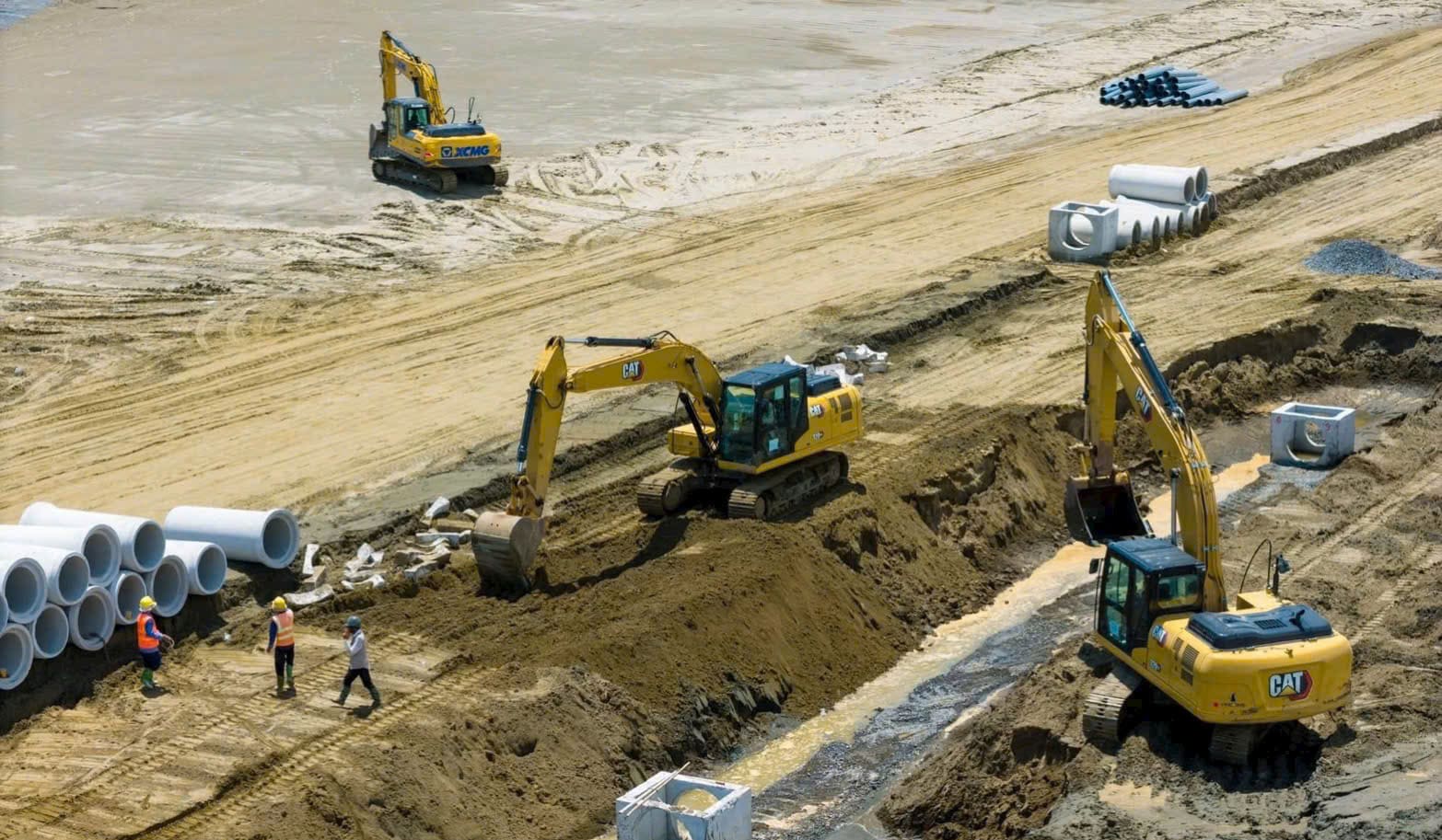 Trong khi đó, tại các phân khu B, D và E, nhiều hạng mục đang được triển khai song song như đặt cống thoát nước, bơm cát san nền và thi công hệ thống đường nội bộ. Hàng trăm máy móc, thiết bị và công nhân được huy động, đảm bảo tiến độ toàn khu diễn ra liên tục và đồng bộ.