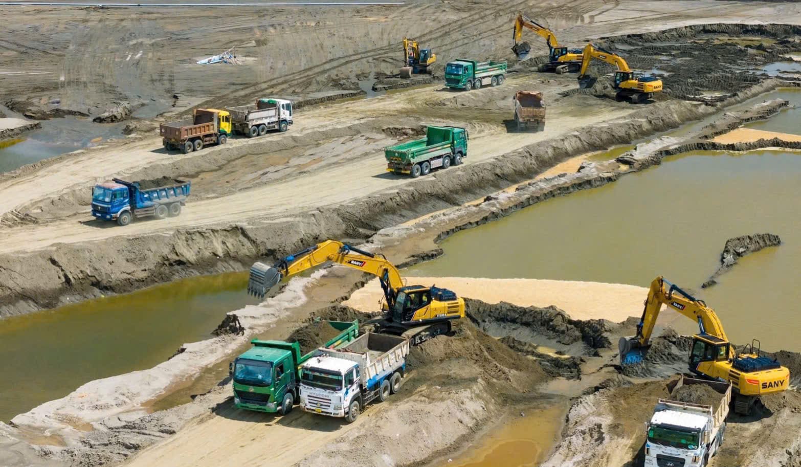 Dọc theo bờ biển, công tác san lấp mặt bằng đang được mở rộng liên tục, hình thành dải đất kéo dài hàng kilomet – minh chứng cho quy mô lớn của giai đoạn đầu dự án.